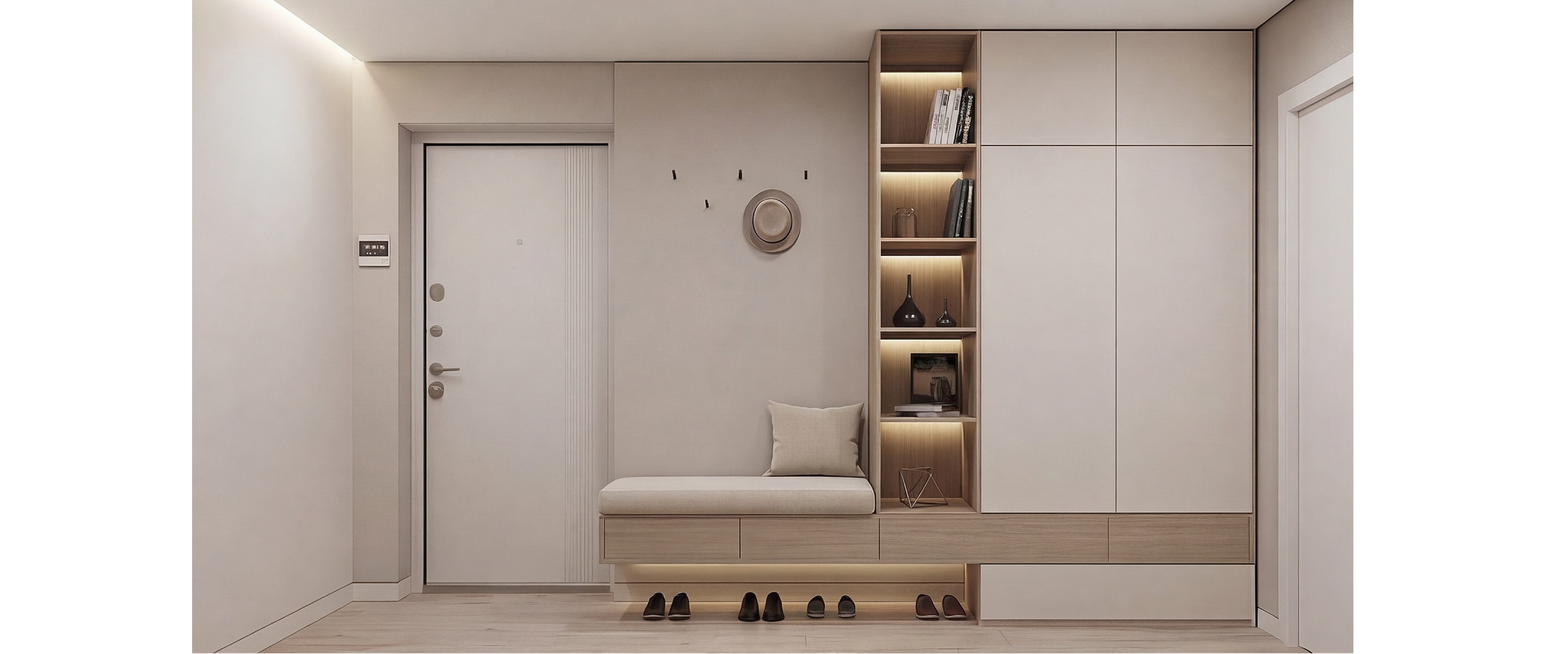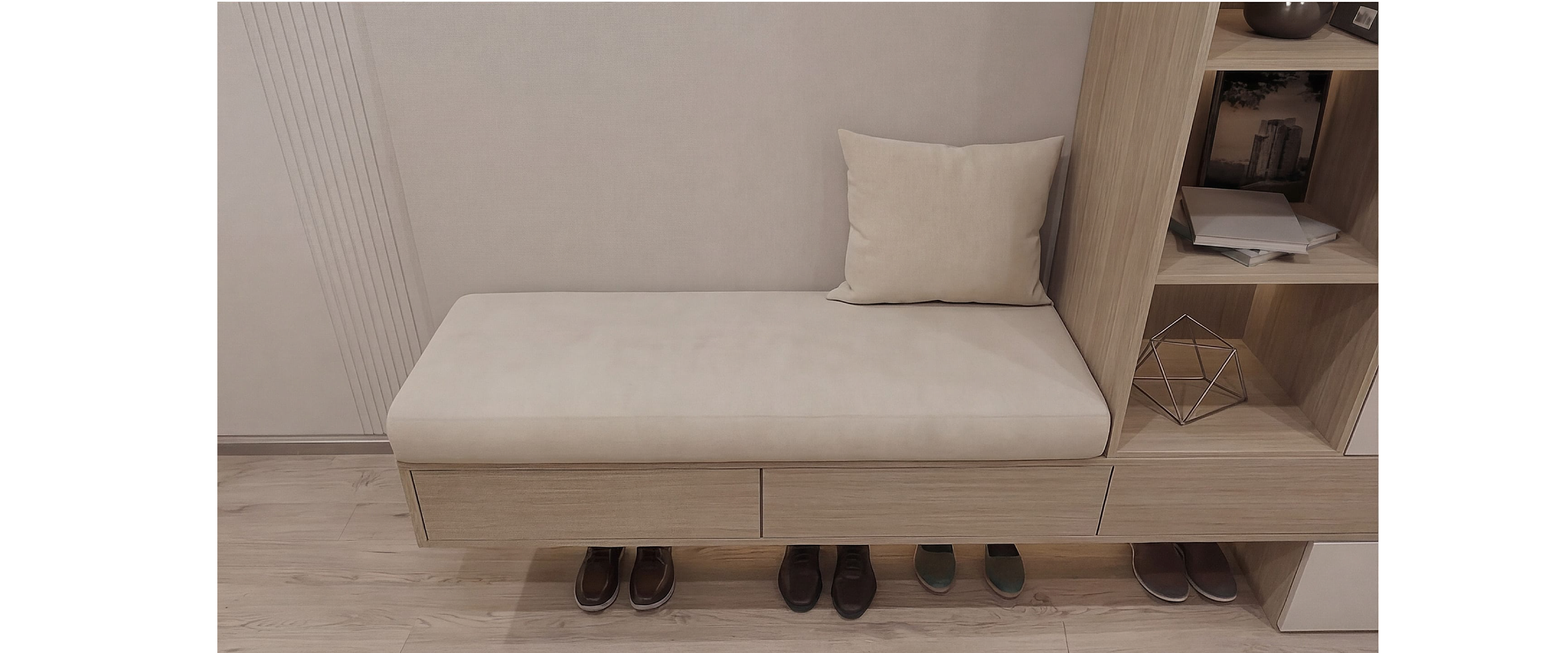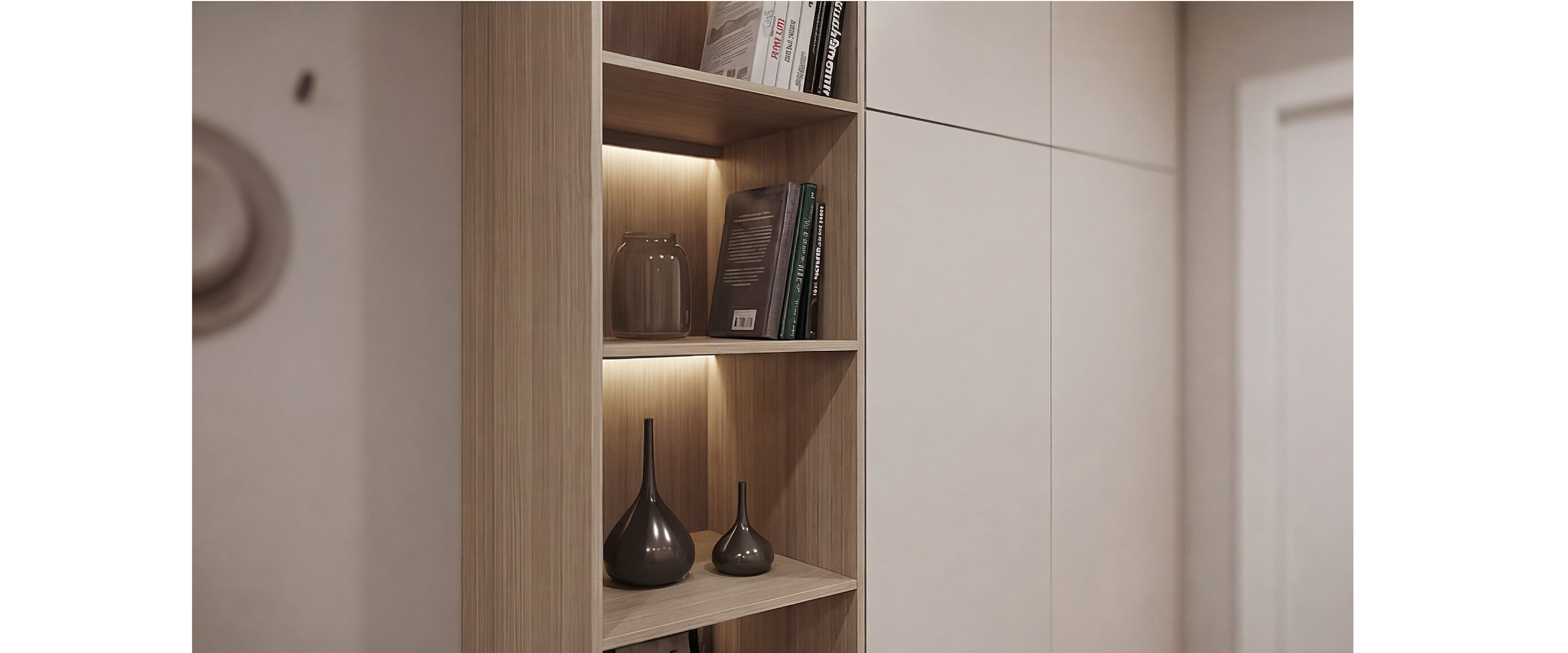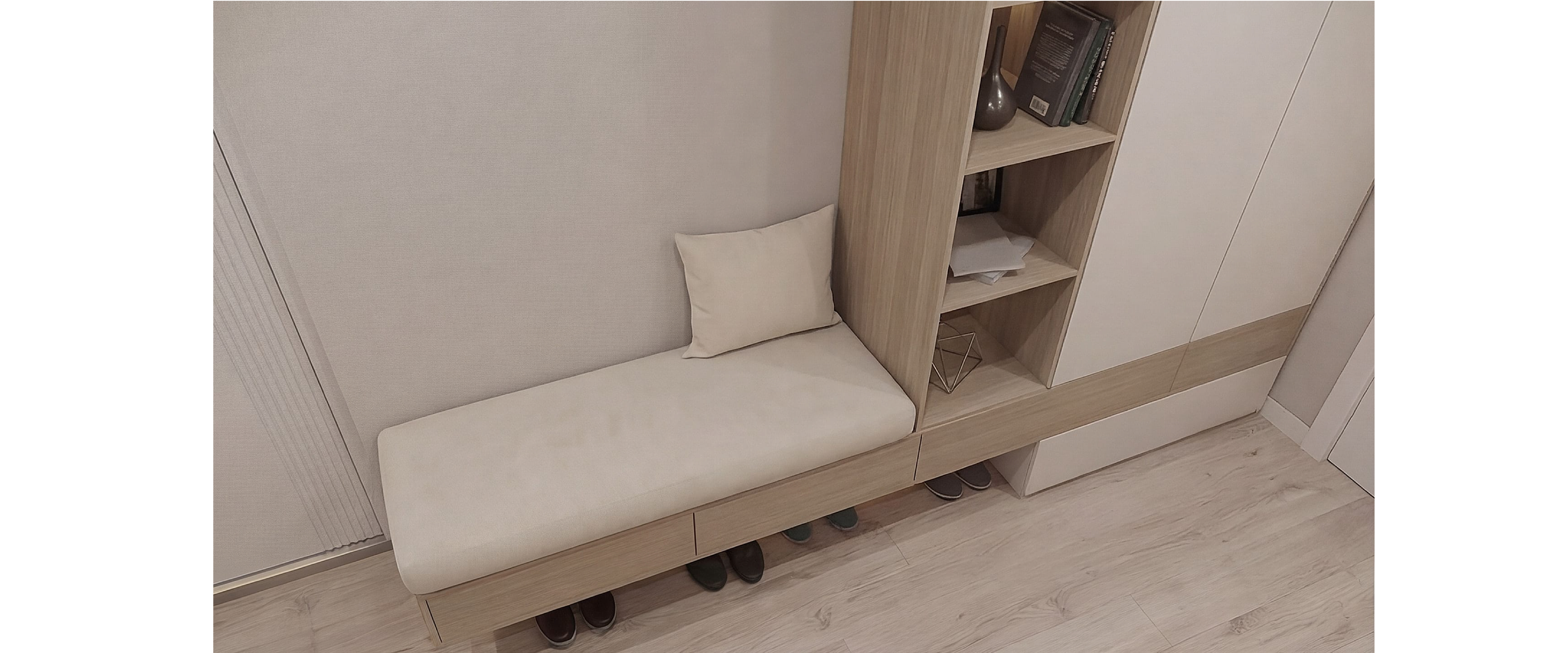 Шкаф с матовыми фасадами, подсветкой и подвесным модулем в древесных оттенках. ЛДСП Egger и фурнитура Blum.