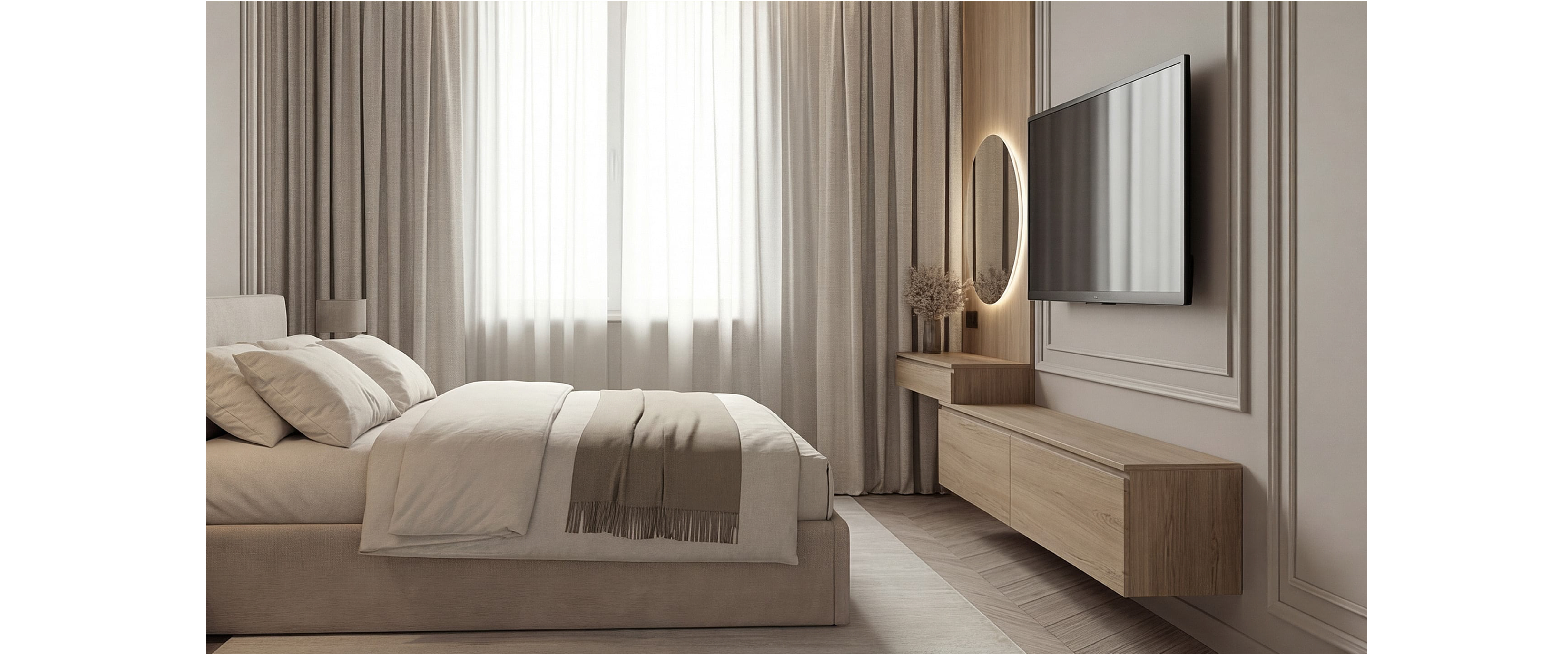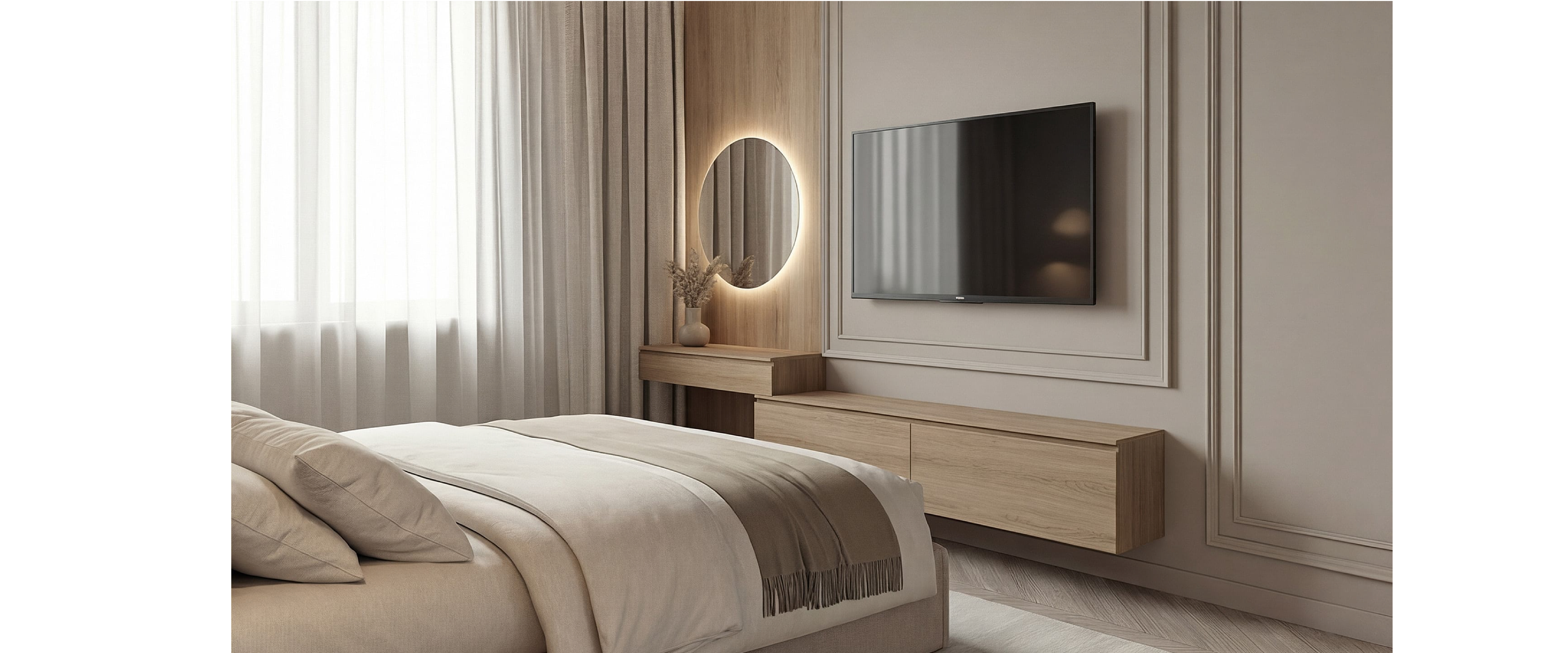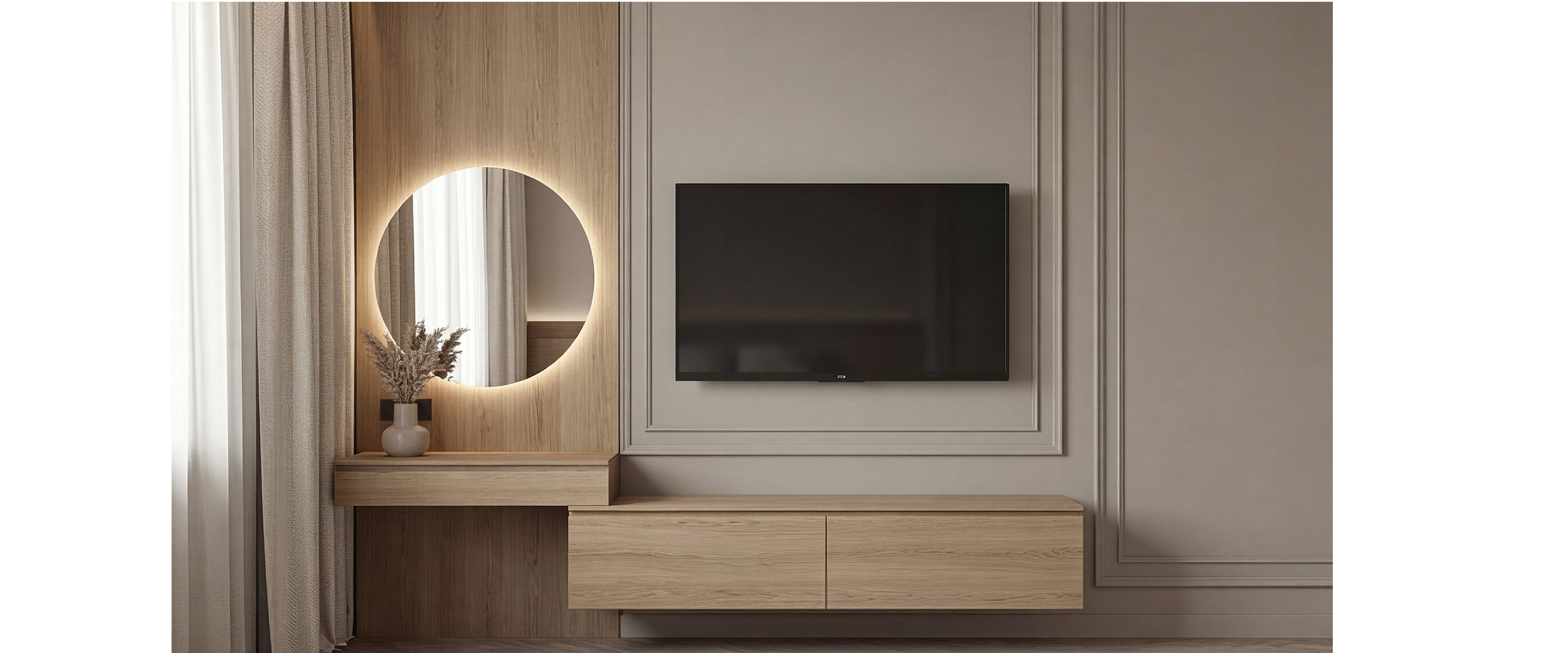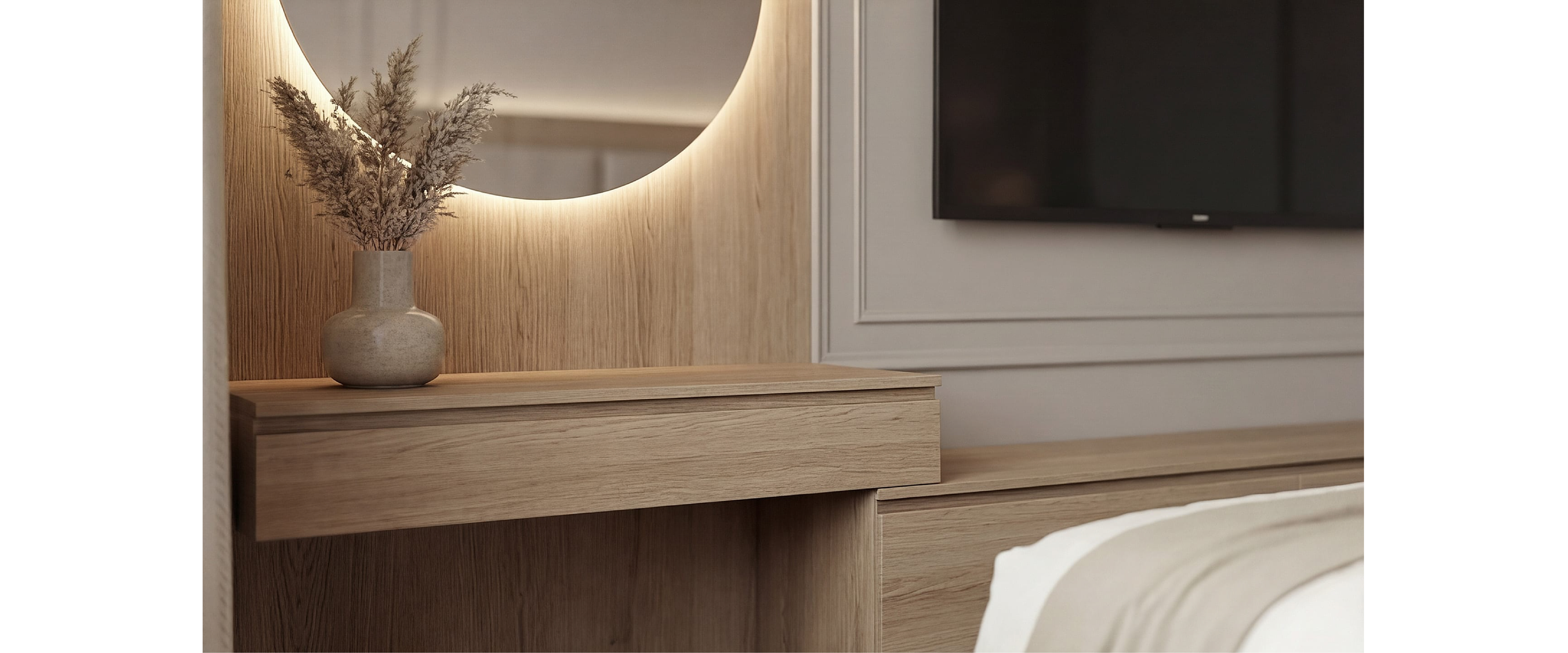 Навесная тумба и стеновая панель из ЛДСП с натуральной древесной текстурой. Сскрытое крепление, встроенные ящики и система push-to-open.