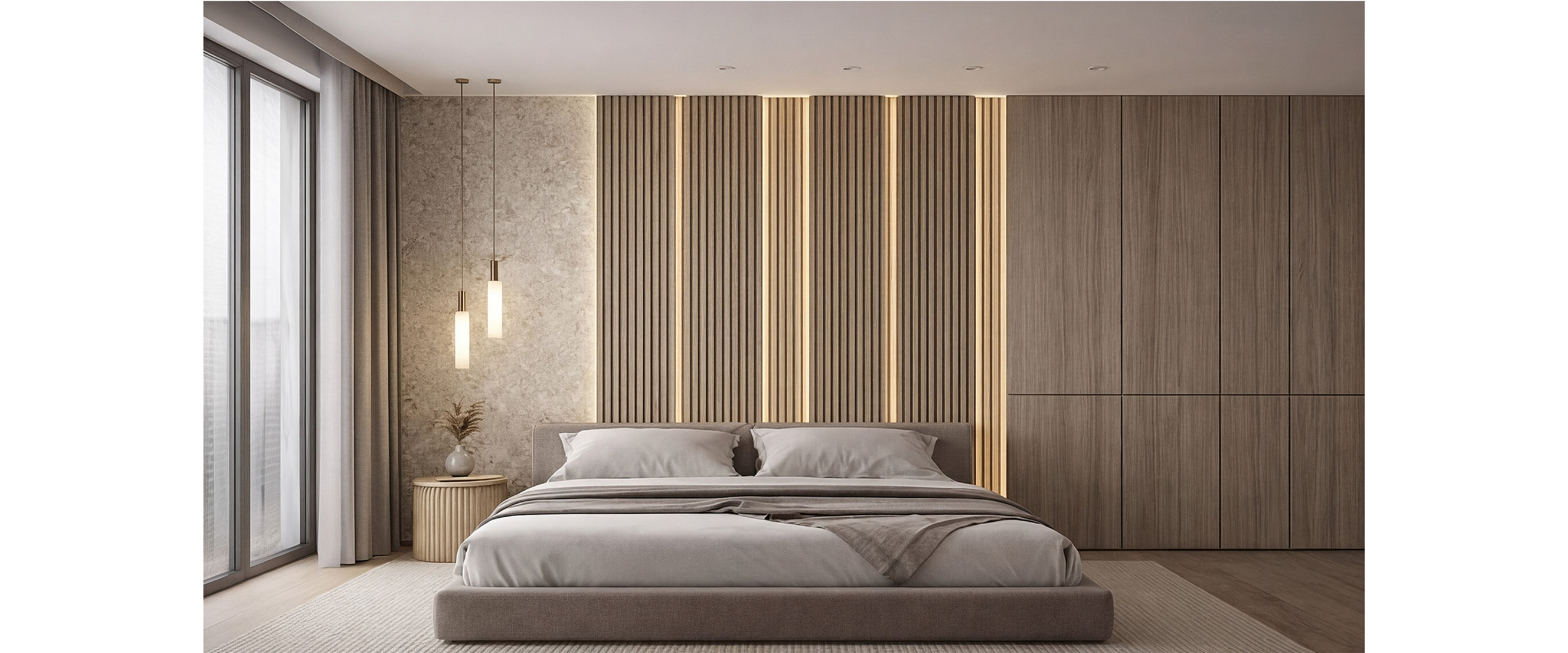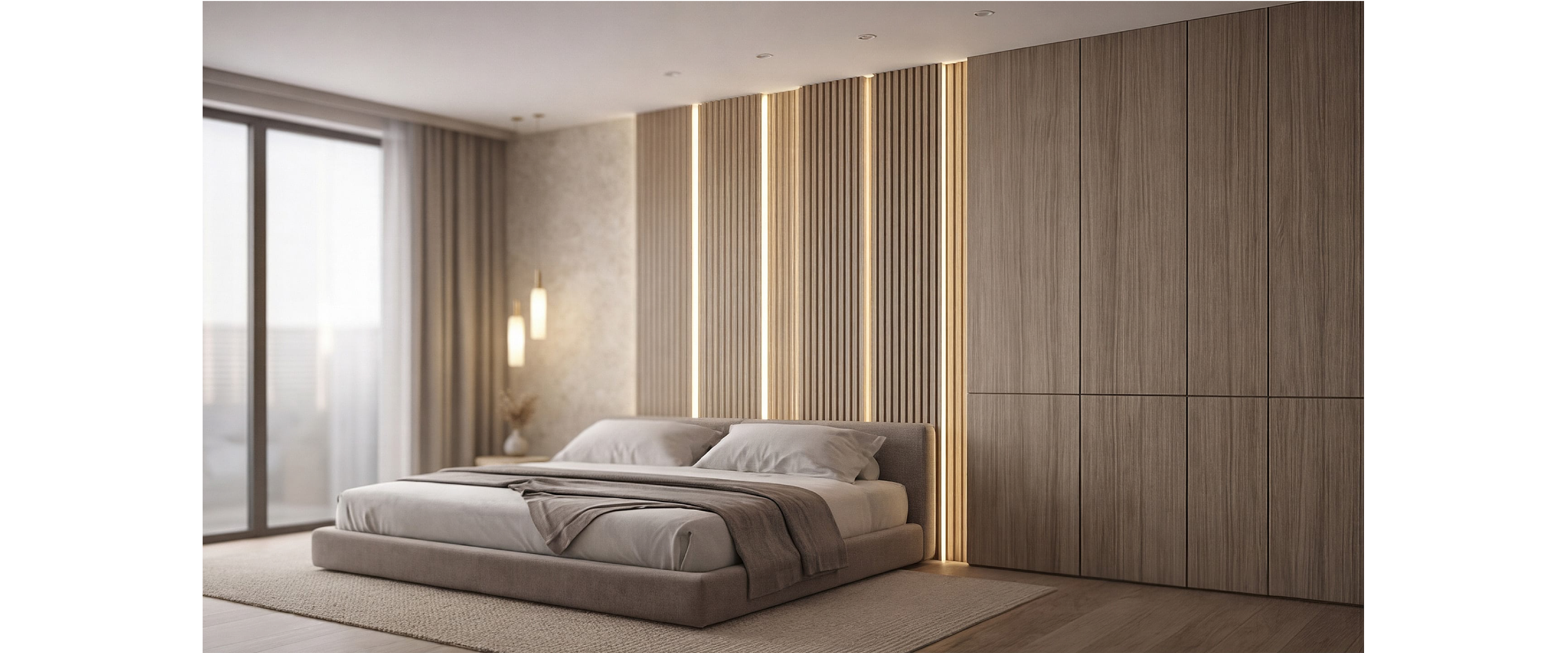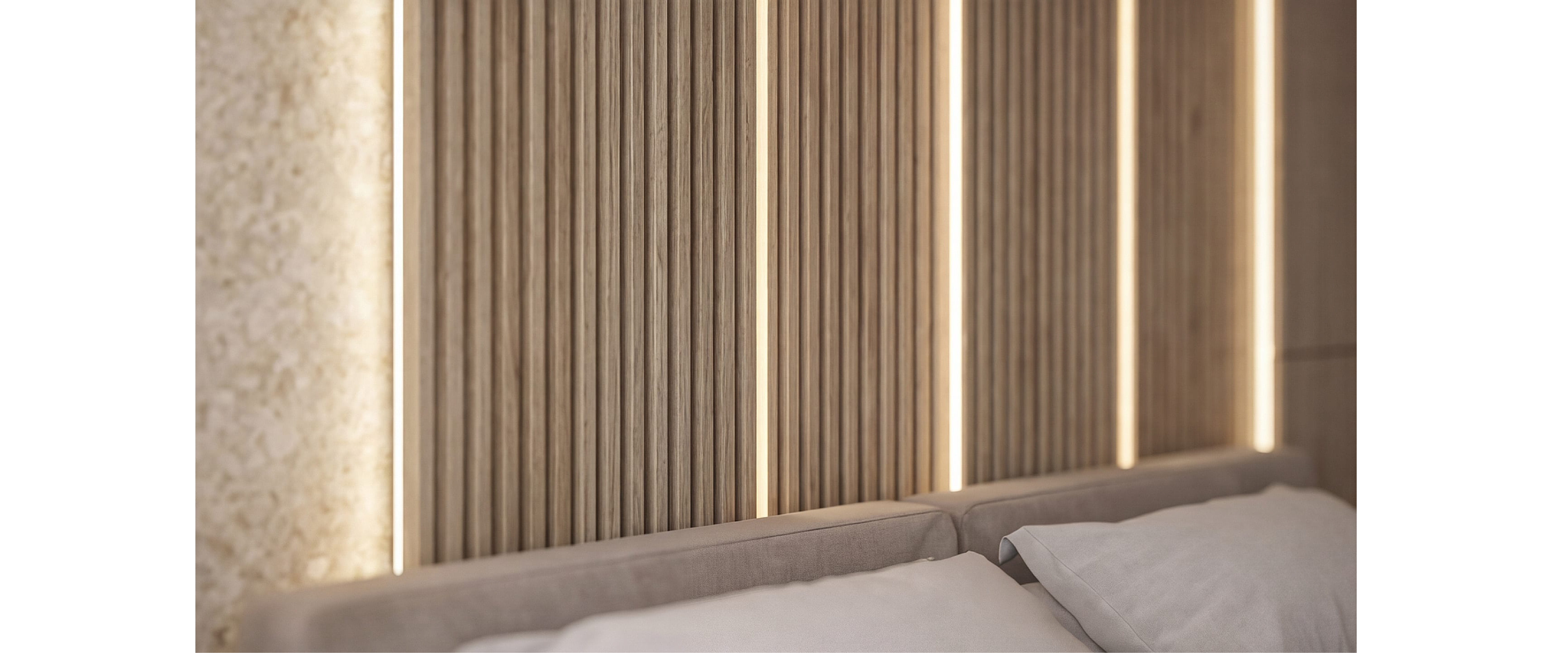 Стеновые панели из натурального шпона с рифлёной текстурой и скрытыми креплениями. Интегрированная LED‑подсветка. Доступны различные оттенки шпона и световые решения.